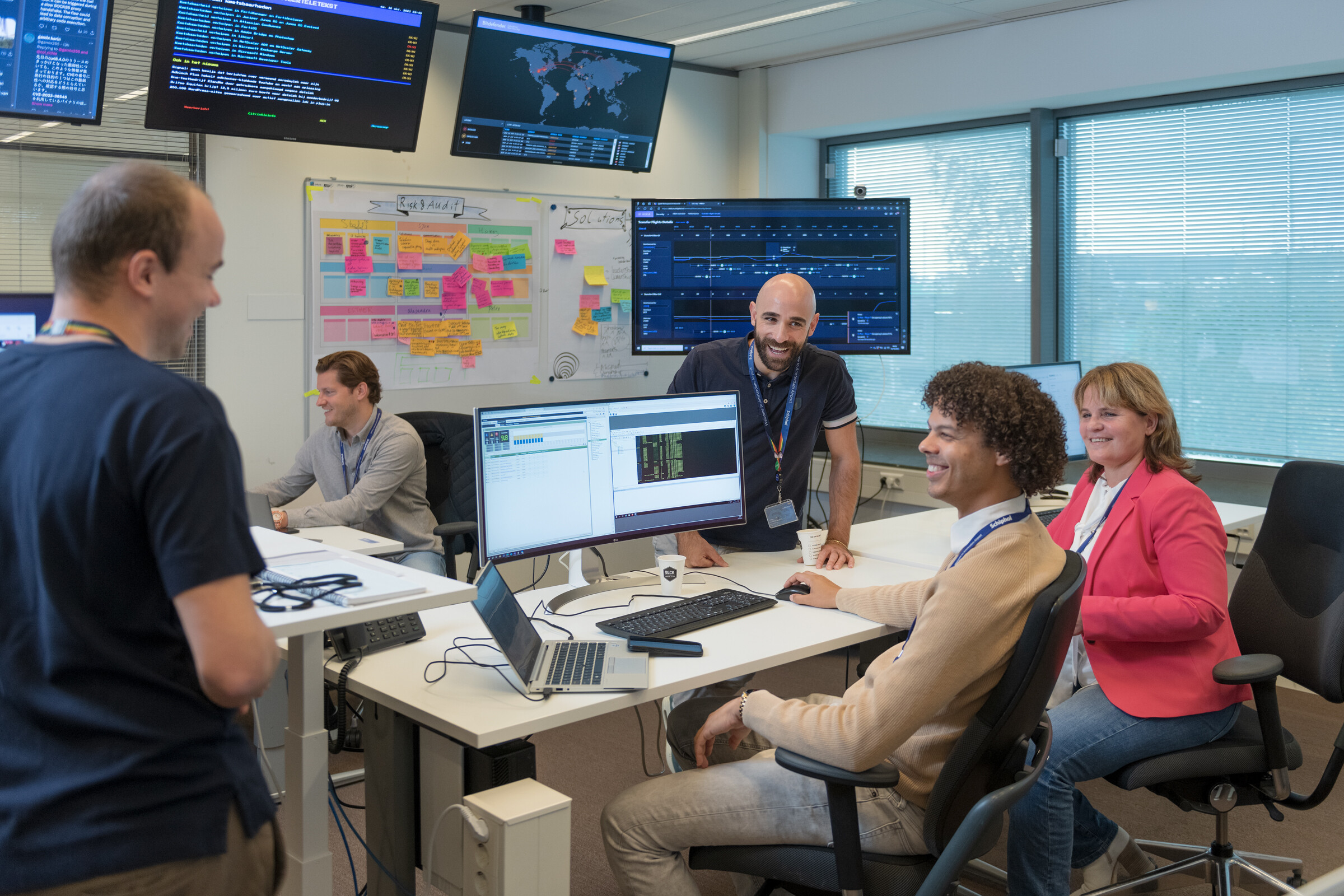 Projectmanagers, scrummasters of producteigenaren. Binnen de IAM-afdeling kom je verschillende rollen tegen. Tijdens de dagelijkse stand-ups overlegt het team wat er speelt en wat belangrijk is. IAM is ook een onderdeel van het Schiphol Cyber Security Center (SCSC). Buiten IAM schakelt het team dus ook met andere specialisten in cybersecurity.